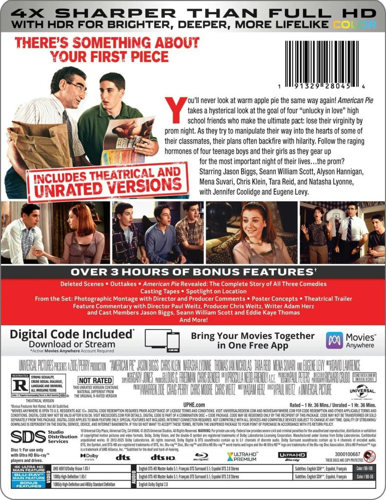 The American Pie 4K steelbook delivers the outrageous teen comedy that defined a generation in a collector’s package. Presented in 4K UHD with Dolby Vision and HDR10, this edition pairs the film’s raunchy humor with sharper detail and richer color than ever before.