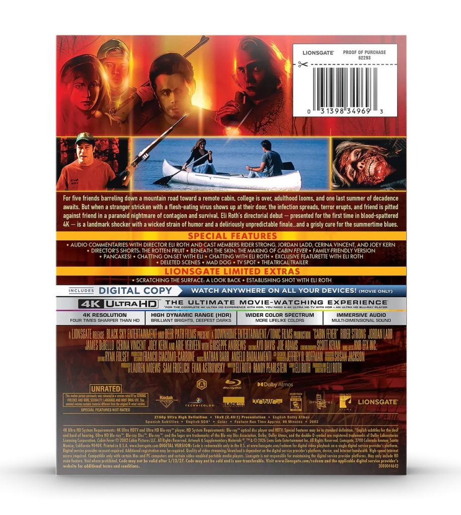 Cabin Fever gets a steelbook release featuring 4K Ultra HD and Blu-ray discs, presenting Eli Roth’s directorial debut in a sharp new format. The film follows five friends escaping to a remote cabin to celebrate the end of college and one last stretch of freedom.