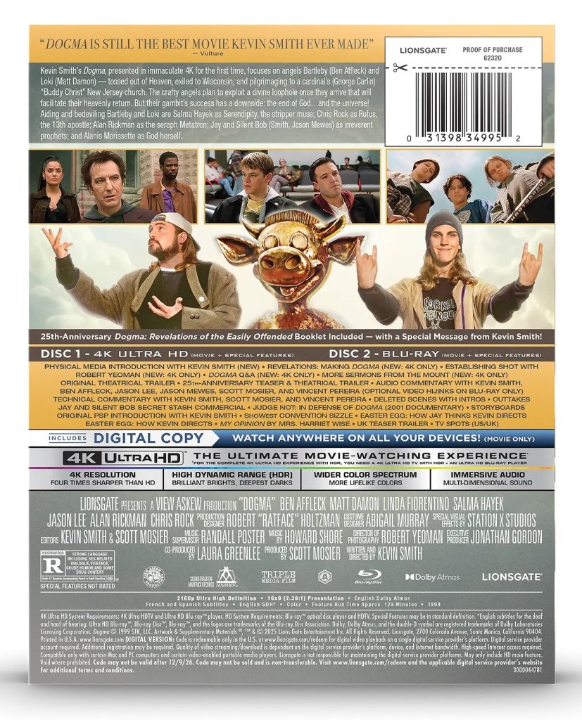Along the way, they cross paths with Chris Rock’s exasperated apostle, Salma Hayek’s muse, Alan Rickman’s weary seraph, and Smith’s own Jay and Silent Bob, in a story that mixes theological satire with sharp humor and unexpected heart. Presented in Dolby Vision and accompanied by newly unearthed bonus features plus the Dogma: Revelations of the Easily Offended booklet, this long-awaited 4K debut finally gives Smith’s cult classic the treatment it deserves.
