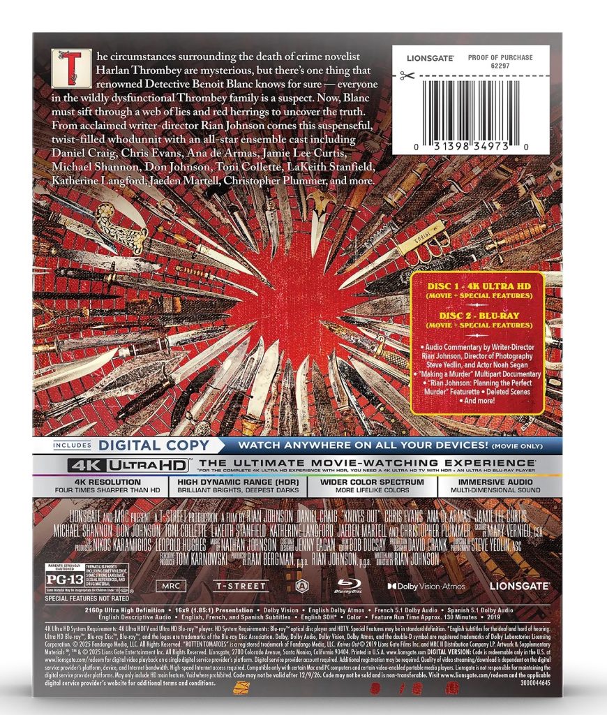 Rian Johnson’s Knives Out arrives on 4K UHD in a steelbook edition that preserves the sharp wit and layered intrigue of this modern whodunit. Daniel Craig stars as detective Benoit Blanc, called to investigate the death of wealthy crime novelist Harlan Thrombey.