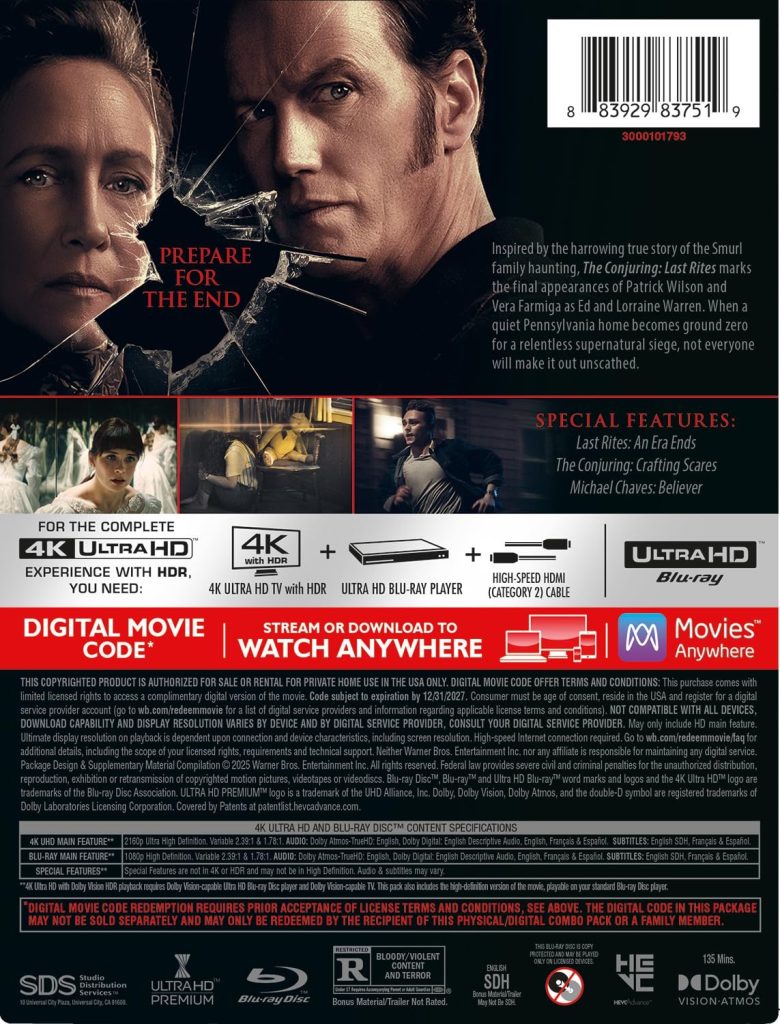 The Conjuring: Last Rites arrives in a 4K Ultra HD steelbook and Blu-ray edition, continuing the haunting legacy of the acclaimed horror series inspired by true events. Vera Farmiga and Patrick Wilson reprise their roles as paranormal investigators Lorraine and Ed Warren, confronting one of their most terrifying cases yet.