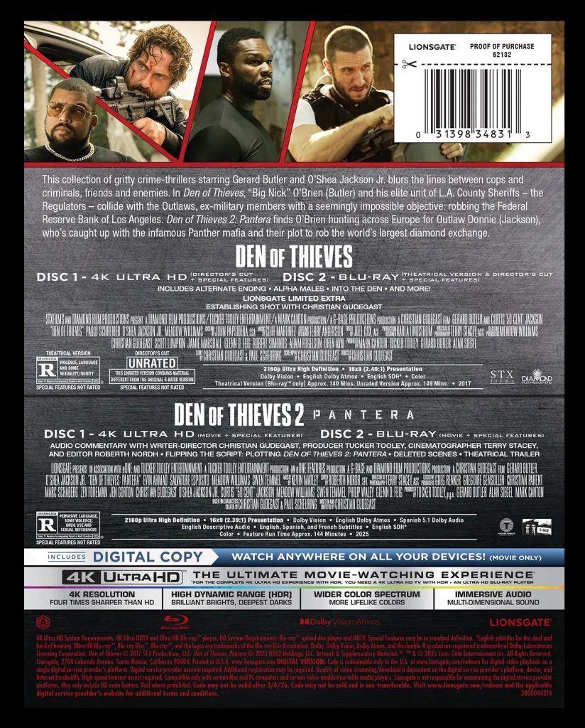 The Den of Thieves collection, starring Gerard Butler and O’Shea Jackson Jr., delivers gritty crime-thrillers that blur the line between cops and criminals, friends and foes. Now available in pristine 4K with Dolby Vision® for the first time, the unrated director’s cut of Den of Thieves follows “Big Nick” O’Brien (Butler) and his elite L.A. County Sheriff unit, the Regulators, as they face off against the Outlaws—ex-military operatives planning the impossible: robbing the Federal Reserve Bank of Los Angeles.